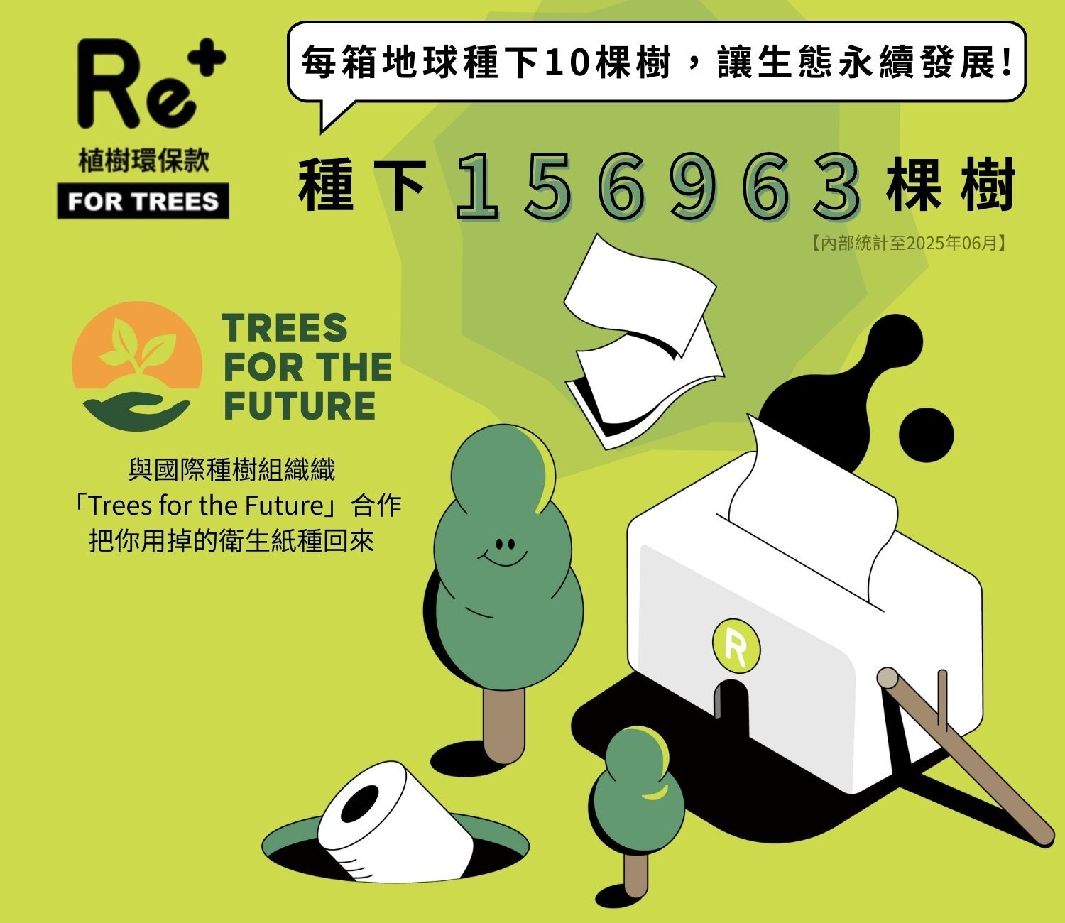 在乎衛生紙首推出環保植樹款,透過植樹計畫,與國際種樹組織「Trees For The Future」合作種樹,每賣出 1 袋 / 1 箱環保植樹款,便實際為地球種下 1 棵 / 10 棵樹,讓消費者可以與 ReTissue 一起愛護孕育我們生長的土地!